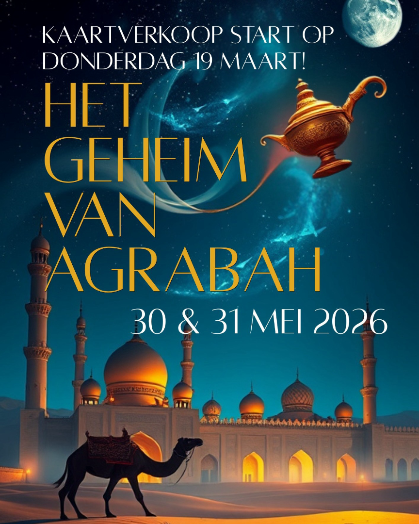 Stap binnen in de magische wereld van zandvlaktes, paleizen en verborgen wonderen. Met trots kondigt de Uithoornse musicalgroep een nieuwe sprankelende productie aan: Het Geheim van Agrabah. Deze betoverende voorstelling neemt het publiek mee naar een oosterse stad waar mysterie, avontuur en magie samenkomen.
